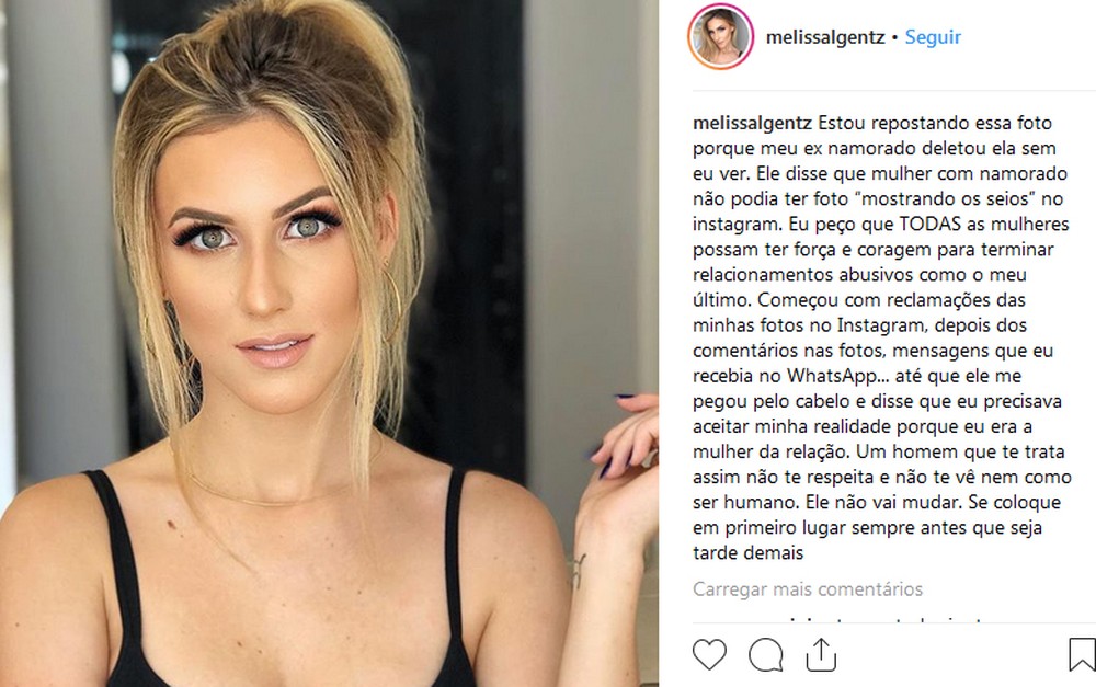 “Estou repostando essa foto porque meu ex namorado deletou ela sem eu ver. Ele disse que mulher com namorado não podia ter foto “mostrando os seios” no instagram. Eu peço que TODAS as mulheres possam ter força e coragem para terminar relacionamentos abusivos como o meu último. Começou com reclamações das minhas fotos no Instagram, depois dos comentários nas fotos, mensagens que eu recebia no WhatsApp… até que ele me pegou pelo cabelo e disse que eu precisava aceitar minha realidade porque eu era a mulher da relação. Um homem que te trata assim não te respeita e não te vê nem como ser humano. Ele não vai mudar. Se coloque em primeiro lugar sempre antes que seja tarde demais”.