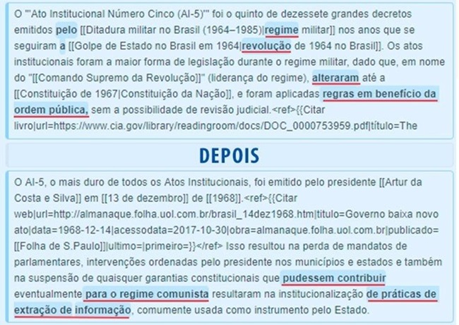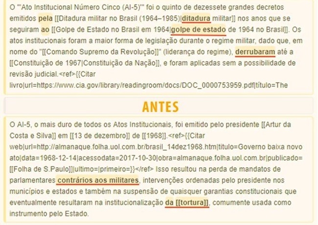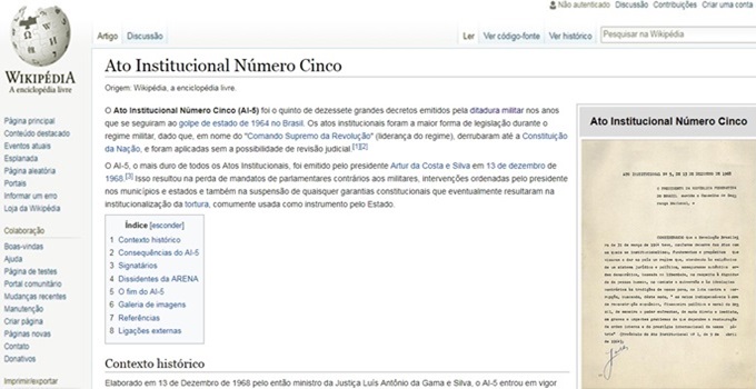 Computador vinculado à Polícia Militar do Estado de São Paulo foi utilizado para fazer uma série de alterações no artigo sobre o AI-5 (Ato Institucional Número Cinco) na Wikipédia, amenizando o período de ditadura militar no Brasil