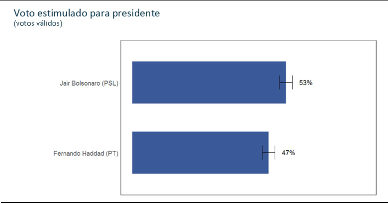 Os números mostram vantagem de Jair Bolsonaro (PSL) sobre Fernando Haddad (PT). O candidato da extrema-direita tem 53% dos votos válidos, enquanto o centro-esquerdista soma 47%.