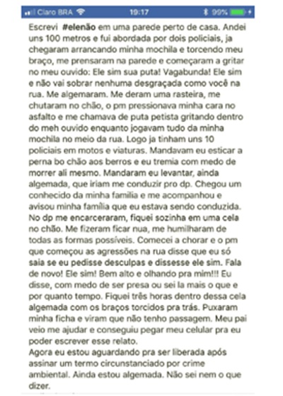 Segundo a Agência Pública, Luisa Alencar estava fazendo um estêncil com os dizeres “Ele Não” em um muro. “Os policiais nem me chamaram nem me advertiram verbalmente, eles já chegaram me agredindo”, contou. Um deles arrancou sua mochila, torceu seu braço e a algemou. “Enquanto ele me prensava na parede, ele começou a gritar no meu ouvido: ‘Sua puta, ele sim, sua puta, vagabunda, ele sim. Não vai ter mais nenhum vagabundo igual a você na rua fazendo essas merdas’”, disse a jovem. Ela fez uma postagem contando o caso no Facebook dela.