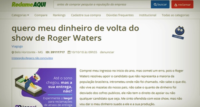 Inconformada com as posições externadas por Roger Waters no show em São Paulo, eleitora de Jair Bolsonaro decidiu ir ao site Reclame Aqui para pedir o dinheiro de volta. Episódio virou piada nas redes