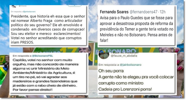 Boa parte das críticas miram a nomeação de Alberto Fraga, condenado, em setembro deste ano, por concussão, ou seja, uso do cargo público para obter vantagem indevida. “O Alberto Fraga não é um puta corrupto? Eu votei em você para acabar com isso (…) A população está do seu lado, não cospe na cara da gente“, tuíta um internauta mencionando Jair.