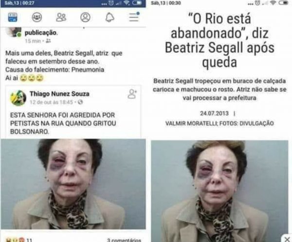 Apoiadores de Jair Bolsonaro espalharam em grupos de WhatsApp e nas redes sociais uma imagem de Beatriz Segall com o rosto machucado.