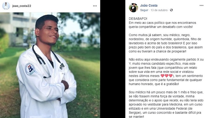 Em meio ao caos político que nos encontramos queria compartilhar um desabafo com vocês! Como muitos já sabem, sou médico, negro, nordestino, de origem humilde, quilombola, filho de lavradores e acima de tudo brasileiro! E por isso prezo pelo bem do país e dos brasileiros, que assim como eu tiveram a chance de prosperar!