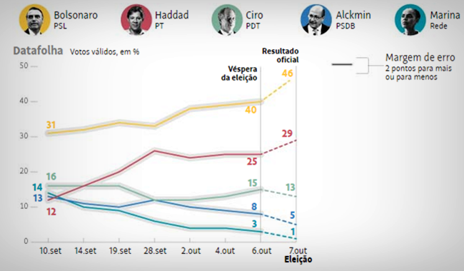 O resultado foi o candidato do PSL com 6 pontos a mais e o petista com 4 pontos a mais. Essa diferença foi tirada dos demais candidatos que pontuaram abaixo do que a pesquisa projetava.