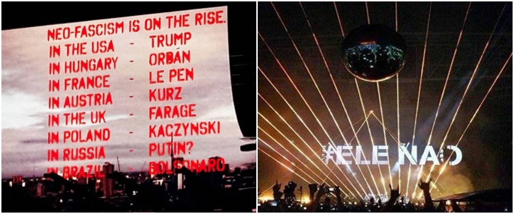 Em outro momento, o telão exibiu vários slides com exemplos de personagens e tendências que merecem resistência, como o “neofascismo”. Na sequência foram mostrados países e líderes políticos onde o neofascismo estaria em ascensão. O Brasil aparece ao lado do nome de Jair Bolsonaro.
