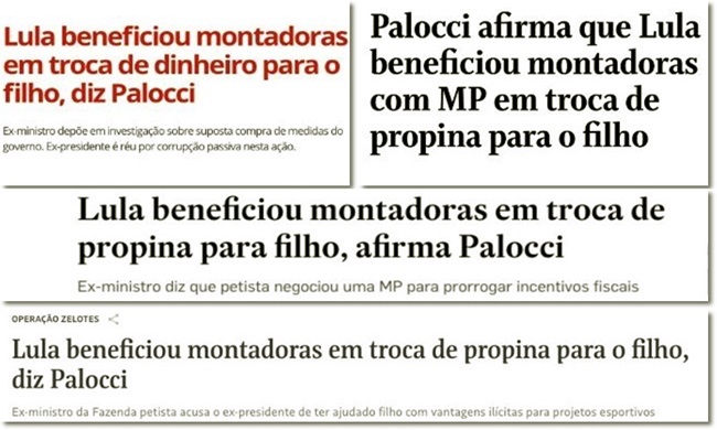Palocci pega um tema de conhecimento geral: o patrocínio de um lobista ao campeonato de rúgbi do filho de Lula. A Zelotes tentou de todos os modos ligar o caso a algum benefício. Chegou a invocar à licitação FX, dos jatos – tocada inteiramente pela Aeronáutica. Depois, às medidas de prorrogação de incentivos para a indústria automobilística fora do eixo Rio-São Paulo – medida dos tempos de FHC e cuja prorrogação foi subscrita por todas as lideranças políticas.