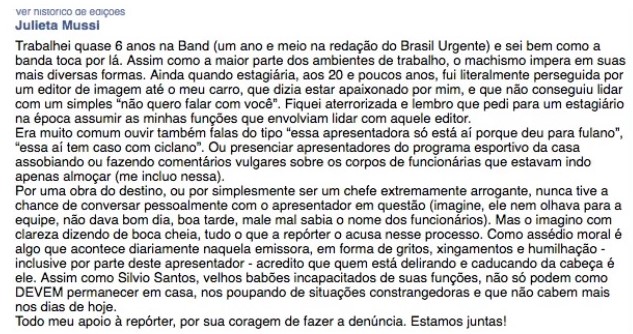 Nas redes sociais, uma jovem que trabalhou na Band disse já ter sofrido assédio na emissora e declarou apoio a Bruna: