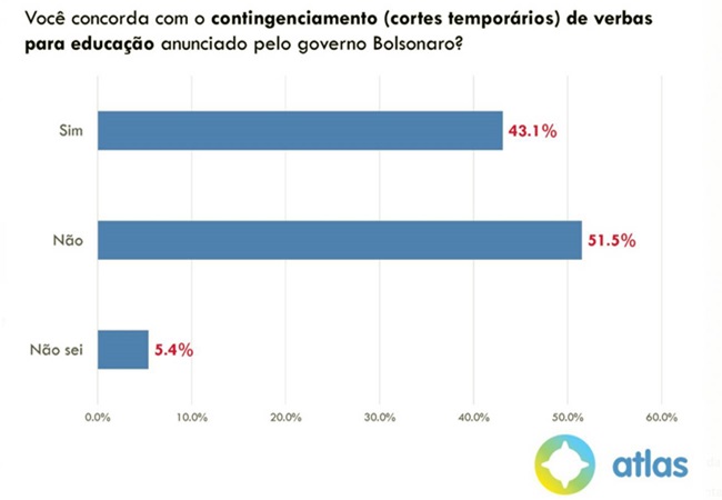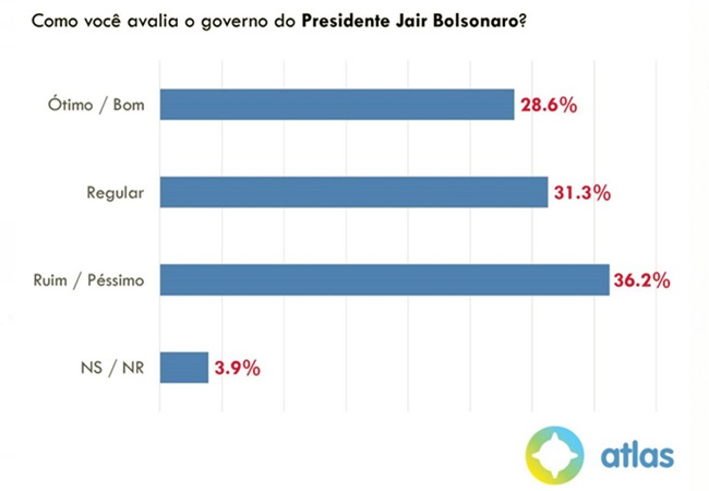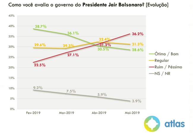 Para Andrei Roman, diretor do Atlas Político, o resultado, colhido entre os dias 19 e 21 de maio, não surpreende “dado o intenso noticiário negativo” a respeito do Governo nas últimas semanas, com repercussão dos cortes na Educação, que provocaram as primeiras manifestações nacionais contra Bolsonaro desde janeiro, a investigação sobre as finanças do filho do presidente, senador Flávio Bolsonaro (86,3% disseram ter tomado conhecimento do caso e 54,3% dizem ser a favor de que ele seja preso), e os resultados econômicos ruins. A pesquisa, feita com 2.000 pessoas recrutadas na Internet e com amostra balanceada por meio de algoritmo, tem margem de erro de 2 pontos percentuais.