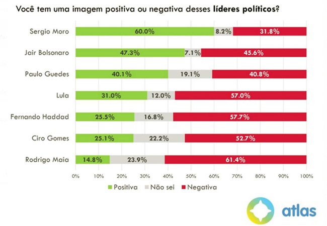 A pesquisa também mostra que o político mais bem avaliado do Governo segue sendo o ministro da Justiça, Sérgio Moro, com 60% de aprovação, conforme revelou o Atlas Político em abril, de modo similar aos resultados encontrados pelo Instituto Datafolha. Entre as personalidades políticas pesquisadas, quem mais subiu na aprovação foi o ex-candidato à presidência, Ciro Gomes (PDT), que, no entanto, segue majoritariamente rejeitado pela população e atrás do ex-presidente Luiz Inácio Lula da Silva, avaliado positivamente por 31% dos brasileiros.