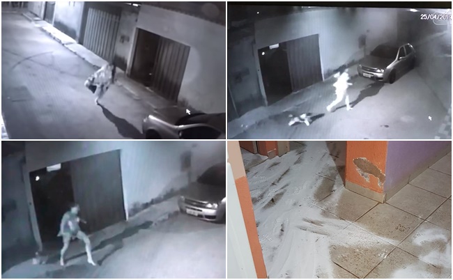 Câmeras de segurança registraram o momento em que o ex-marido Júlio César dos Santos, de 55 anos, entra na casa da ex-mulher. Após jogar ácido sulfúrico nos olhos de Cácia, ele sacou um revólver, mas a arma falhou.