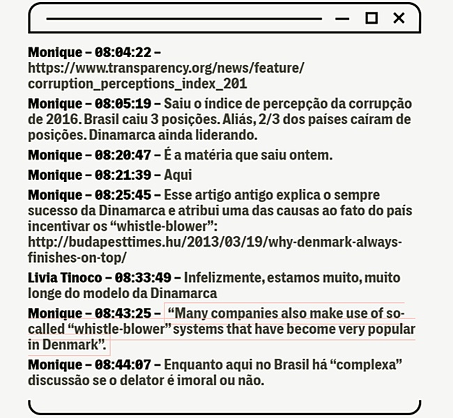 Após publicar um link para o ranking num chat no Telegram chamado “BD”, a procuradora Monique Cheker (que não pertence à Lava Jato em Curitiba) explicou que o sucesso dos esforços de combate a corrupção na Dinamarca se devem porque o país – ao contrário do Brasil – valoriza e protege as fontes que expõe corrupção (os whistleblowers).