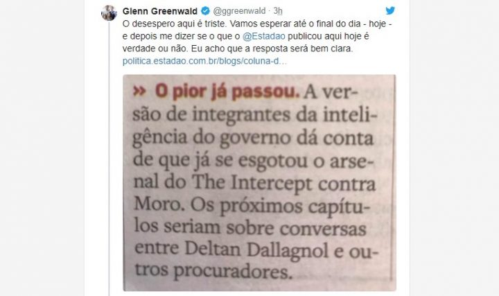Pelo Twitter, Greenwald classificou a nota como “desespero”. “Vamos esperar até o final do dia – hoje – e depois me dizer se o que o @Estadao publicou aqui hoje é verdade ou não. Eu acho que a resposta será bem clara”, afirmou o editor do The Intercept, anunciando que novos trechos das conversas entre Moro e procuradores serão revelados na noite desta sexta-feira (28).