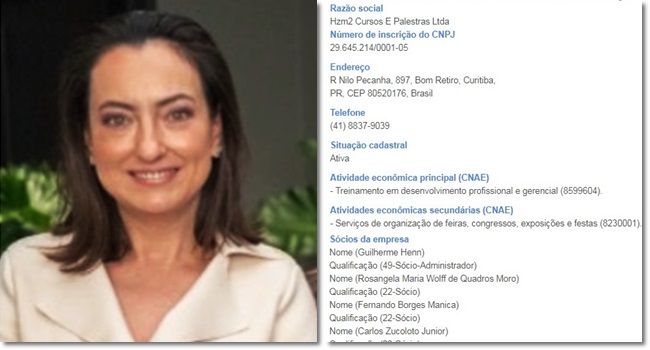A advogada e esposa do juiz federal Sérgio Moro, Rosângela Wolff Moro, abriu, em janeiro de 2018, uma empresa de cursos e palestras no mesmo endereço do escritório de Vicente Paula Santos, listado como advogado dos procuradores da força-tarefa da operação Lava Jato Carlos Fernando dos Santos Lima e Januário Paludo.