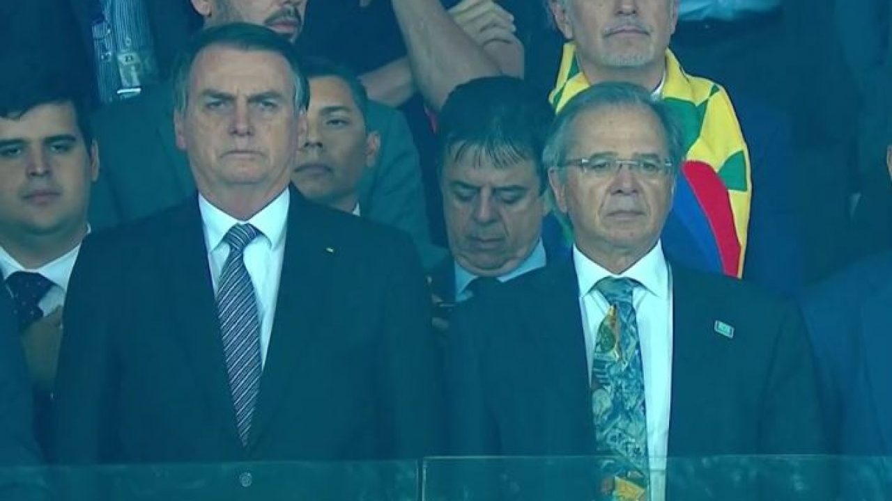 Minutos antes, durante o hino nacional, Bolsonaro também havia sido vaiado, de maneira mais tímida, quando apareceu ao lado do ministro da Economia, Paulo Guedes.