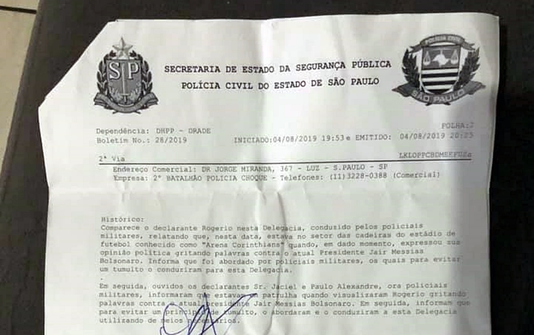O vendedor Rogério Lemes foi agredido, detido e levado à delegacia por policiais militares (PMs), no último domingo (4), apenas por protestar contra o presidente Jair Bolsonaro. Torcedor do Corinthians, ele estava na arquibancada no jogo da equipe contra o Palmeiras, na rodada de fim de semana do Campeonato Brasileiro, em Itaquera, na zona leste de São Paulo.