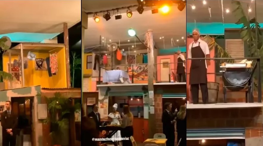 A empresa decorou a festa com um cenário que simulava uma favela, com direito a churrasco na laje servido por um homem negro, paredes com tijolos expostos, fios de ligação elétrica clandestina, roupas penduradas no varal e até uma pia cheia de louça.