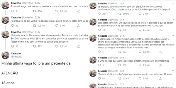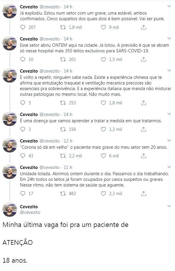 “Já explodiu. Estou num setor com um grave, uma estável, ambos confirmados. Cinco suspeitos dos quais dois é bem possível. Esse setor abriu ontem aqui na cidade e já lotou. Nesse ritmo não há sistema de saúde que aguente […] Minha última vaga foi para um paciente de, ATENÇÃO, 18 anos […]”, conta o médico.