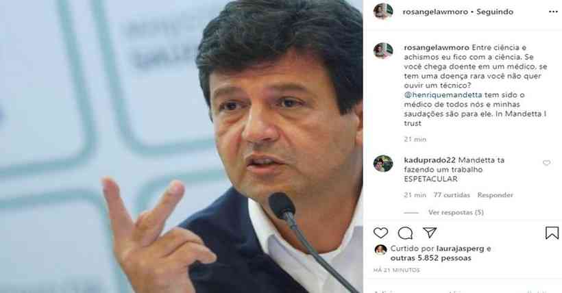 A advogada postou uma foto de Mandetta em seu perfil no Instagram e escreveu: “Entre a ciência e achismos, eu fico com a ciência. Se você chega doente em um médico, se tem uma doença rara, você não quer ouvir um técnico? Mandetta tem sido o médico de todos nós e minhas saudações são para ele. In Mandetta I Trust”. A publicação foi apagada logo depois.