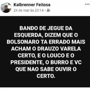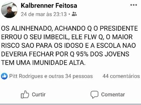 Em uma outra postagem feita pela vítima no dia 24 de março, dia em que o presidente Jair Bolsonaro fez seu primeiro pronunciamento em rede nacional a respeito da pandemia, ele defendeu a ideia de que crianças deveriam voltar às aulas e que apenas idosos permanecessem em casa, tal qual sugeriu o presidente.