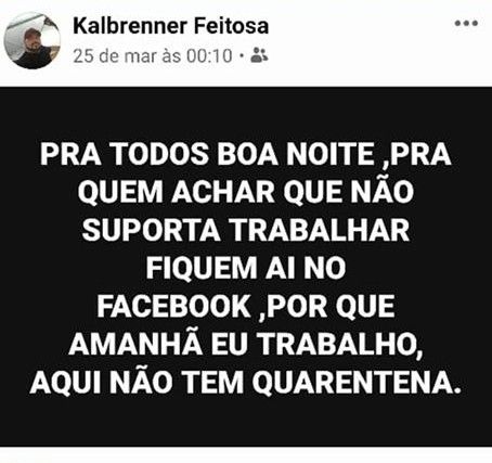 Em uma de suas publicações (imagens abaixo), ele afirma não ser adepto à quarentena. “Pra todos, boa noite. Pra quem achar que não suporta trabalhar, fiquem no Facebook, porque amanhã eu trabalho. Aqui não tem quarentena”.
