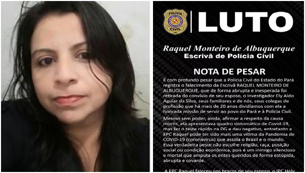 A policial civil Raquel Monteiro de Albuquerque, de 48 anos, morreu na noite do último sábado (18) em Belém (PA) vítima de coronavírus. “Ela faleceu nos braços do marido, dentro do carro, na porta do Hospital Dom Zico”, lamentou Daniel Costa Moura, primo da escrivã.