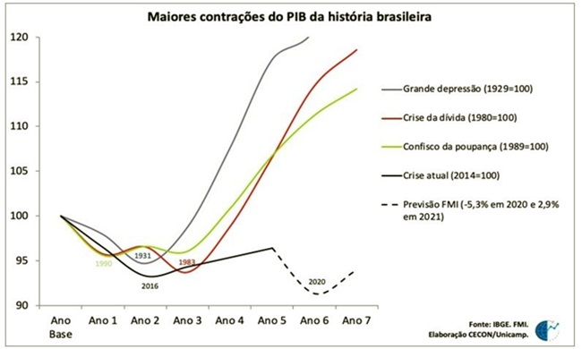 Semanas atrás, para o Brasil, o FMI estimava queda do PIB de 5,3%. Seguindo essa previsão, desde 2015 o Brasil estaria em uma trajetória em “W”, com queda brusca até 2016, uma “recuperação” até 2019 (que, porém, não recompõe nem o patamar inicial), e nova queda brusca em 2020 com a coronacrise. Esse seria o pior momento de crise econômica no país em termos de queda do PIB, mesmo se comparado à grande depressão, à crise da dívida e ao confisco da poupança em 1989, como mostram cálculos do Cecon/IE/Unicamp no gráfico.