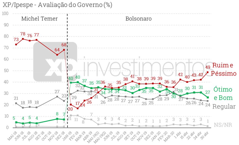 Uma semana após a demissão do ex-juiz Sergio Moro do Ministério da Justiça e Segurança Pública, o governo Jair Bolsonaro registra seus piores níveis de avaliação junto ao eleitorado. É o que mostra a nova rodada da pesquisa XP/Ipespe, realizada entre 28 e 30 de abril.