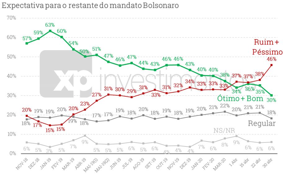 Segundo o levantamento, concluído antes de mais uma participação do presidente Jair Bolsonaro (sem partido) em manifestações favoráveis à intervenção militar e ao fechamento do Congresso Nacional e do Supremo Tribunal Federal, agora 27% avaliam a atual administração como ótima ou boa — o que corresponde a uma queda de 4 pontos percentuais em relação à semana anterior.