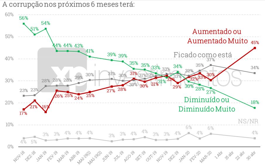 A crise entre Bolsonaro e Moro também piorou drasticamente a imagem do governo em relação ao combate a crimes de colarinho branco. De acordo com a pesquisa, 45% dos eleitores acreditam que a corrupção aumentará nos próximos seis meses – alta de 15 pontos em relação ao levantamento de março. Já o grupo dos que esperam uma diminuição da corrupção minguou de 27% para 18%.