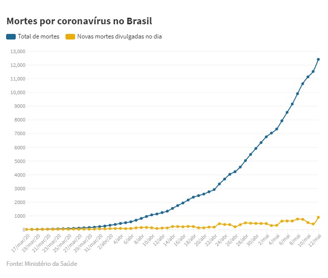 O Ministério da Saúde divulgou, na tarde de hoje, que 12.400 pessoas já morreram vítimas do novo coronavírus no Brasil. São 881 óbitos registrados em apenas 24 horas, o maior número em um dia desde o início da pandemia. Até então, o recorde no país era de 751 mortes em um dia.