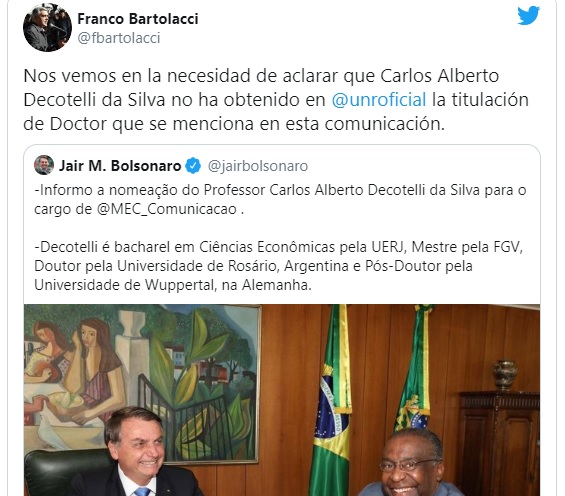 No Twitter, o reitor explicou. “Nos vemos na necessidade de explicar que Carlos Alberto Decotelli da Silva não obteve, a Universidade de Rosário, o título de Doutor mencionado nesta comunicação”, explica Bartolacci, usando a publicação de Bolsonaro como referência.