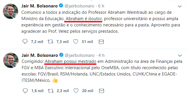 Ao anunciar o nome do novo ministro da Educação, Jair Bolsonaro foi às redes sociais para destacar o currículo do escolhido. O doutorado falso, revelado pelo reitor da universidade, foi apenas a primeira mentira descoberta