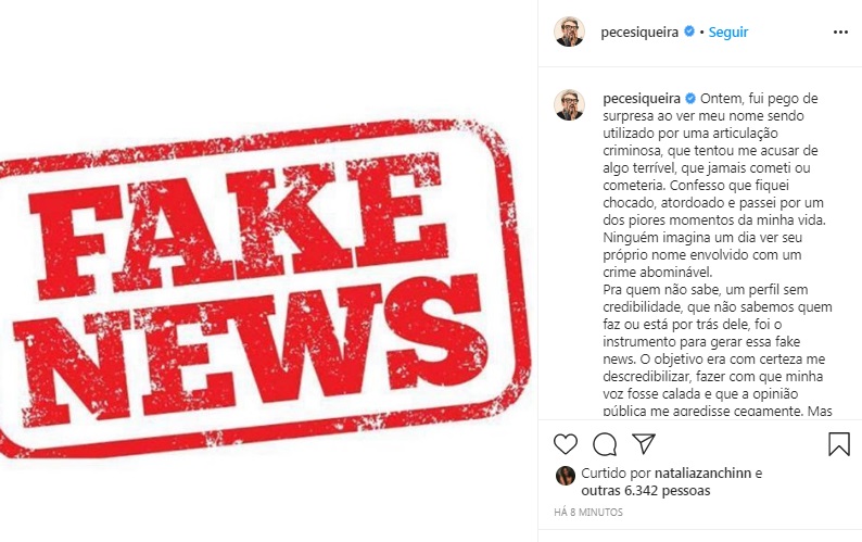 Eu vim aqui esclarecer isso a vocês e a todos que estiveram interessados neste assunto. Tenho recebido ameaças devido ao meu posicionamento político há algum tempo, mas nunca imaginei que seria atingido por algo tão baixo. No mais, muito obrigado pelo carinho de quem me conhece e das pessoas que me seguem. Isso tem sido importante nesse momento. Muito obrigado, de verdade” falou em seu perfil no Instagram.