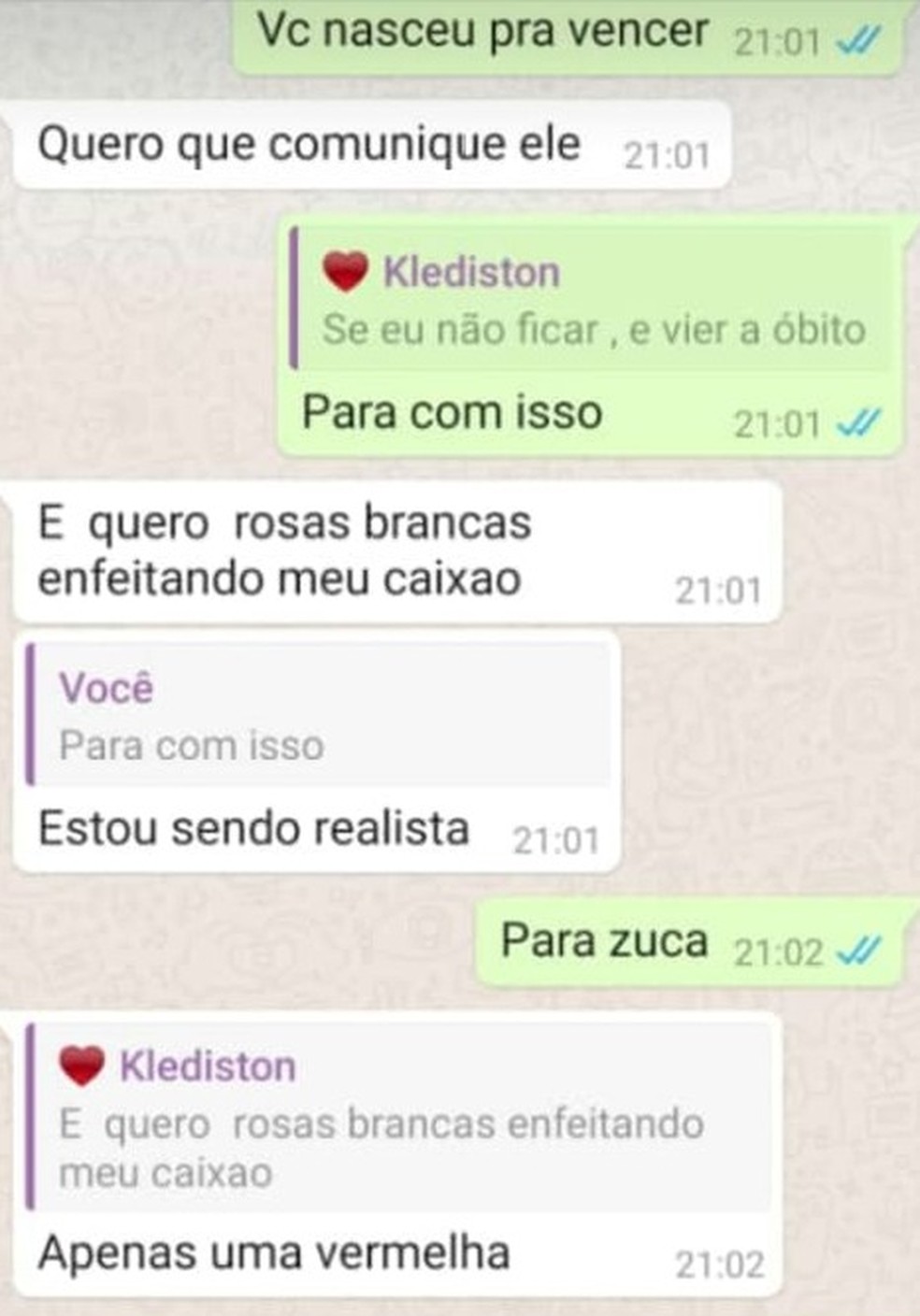O quadro de saúde de Klediston se agravou no dia 18 de julho e ele precisou ser internado na UTI. Elisângela da Silva Faria, mãe do jovem, conta que no dia em que seria entubado ele mandou mensagem para a família dizendo que poderia não resistir. Na mensagem à mãe, o jovem disse que, caso fosse a óbito, gostaria de ter flores brancas e uma vermelha no caixão dele.
