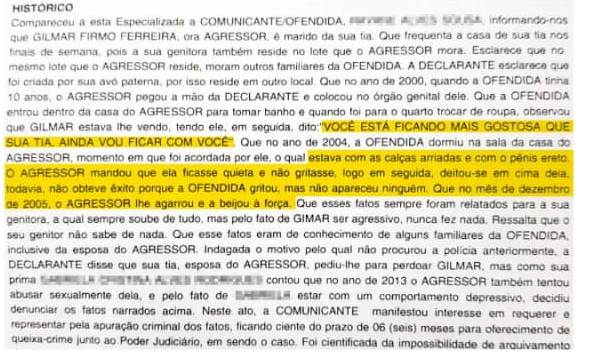 A garota conta ainda que, em 2005, Gilmar a beijou à força. Segundo a ocorrência policial, a mãe dela e a tia, mulher de Gilmar, sabiam dos abusos, mas nada fizeram, porque o homem tinha um perfil agressivo.