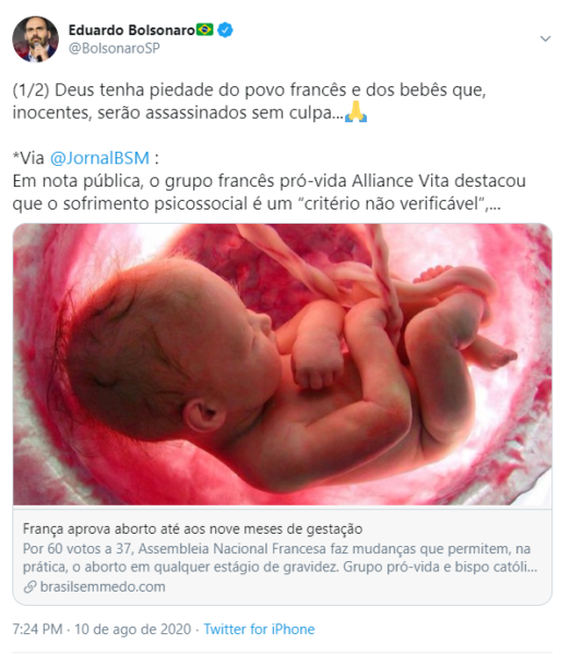 Eduardo compartilhou um texto do site de Olavo de Carvalho, Brasil Sem Medo, que afirma que a “França aprovou o aborto até aos nove meses de gestação”. O texto é baseado no veículo de extrema-direita Breitbart e traz graves distorções.