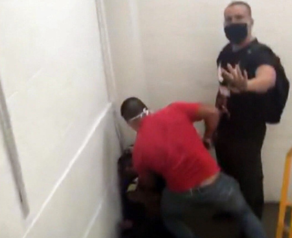 Imagens divulgadas nas redes sociais pelo primo da vítima mostram Matheus no chão, imobilizado por um homem de camisa vermelha. Outro homem, de camisa preta, participa da ação. Pessoas que estavam no shopping se aproximam e exigem que ele seja solto.