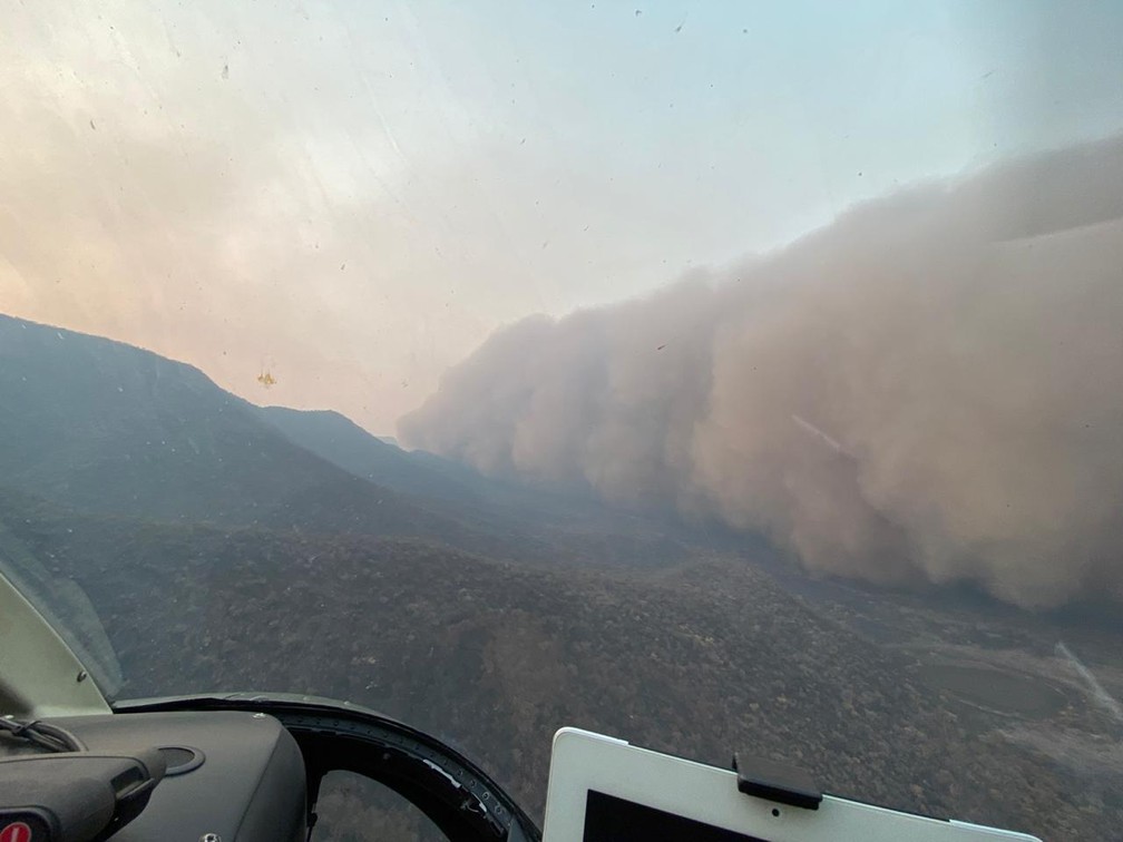 O piloto de um helicóptero do Instituto Brasileiro do Meio Ambiente e dos Recursos Naturais (Ibama) precisou fazer manobras para desviar de uma tempestade de cinzas e areia que se formou região da Serra do Amolar (MS), na última terça-feira (13). Nas últimas semanas, as queimadas avançaram sobre a serra, que é uma das áreas mais preservadas do Pantanal.