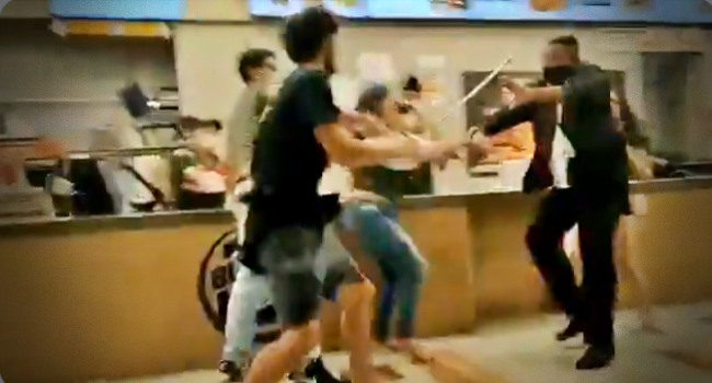 O vigilante tenta conter a situação, até que outros clientes partem em defesa dos atendentes e agridem os garotos com socos, principalmente no rosto. O vídeo termina com um deles sendo colocado para fora pelo vigia.