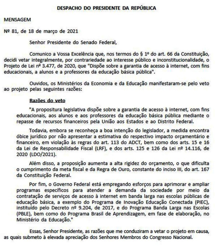 Projeto que assegura internet grátis a professores e alunos já tinha sido aprovado na Câmara e no Senado, mas foi integralmente vetado pelo presidente Bolsonaro