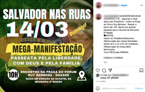Este domingo foi marcado por dois atos em apoio ao presidente Jair Bolsonaro. O primeiro foi uma carreta que saiu da região do antigo Aeroclube e percorreu a orla da capital baiana, enquanto o segundo foi a manifestação nas proximidades do quartel da 6ª região militar, na Mouraria.