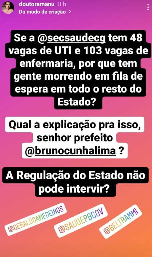 “Estamos com até 50 pacientes por dia na fila aguardando vaga de UTI. Se a própria Prefeitura de Campina divulga que há dezenas de leitos disponíveis, por que estão segurando essas vagas? Não há mais o que esperar”, acrescentou.