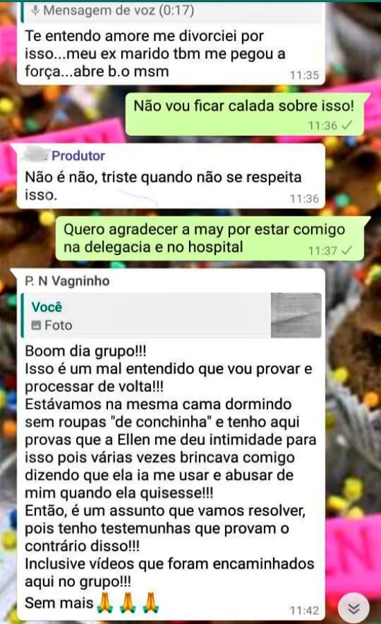 Além do boletim de ocorrência e exame de corpo de delito, Ellen expôs o ator em um grupo de trabalho do WhatsApp de atores, atrizes e produtores do universo pornô brasileiro. No mesmo grupo, Vagninho disse ter testemunhas que provam o contrário e que tudo foi um “mal entendido”.