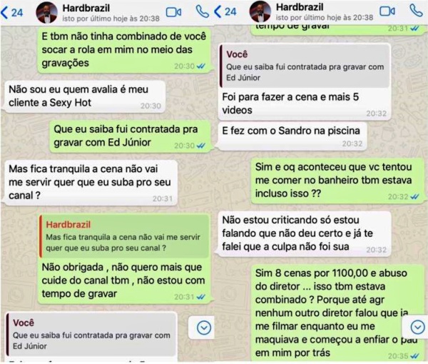 Assim como Ágatha, a atriz Evelyn Carolina, de 23 anos, também diz ter sofrido abuso sexual de Fábio, em seu primeiro trabalho para a HardBrazil em 2018. “Sofri abuso do Fábio antes de uma gravação. Estava me maquiando quando me abusou, não havia cenas combinadas entre nós. Na hora o ator que iria gravar comigo entrou no banheiro e viu tudo. Na época não fiz denúncia pois ele me ligava ameaçando acabar com minha carreira”.
