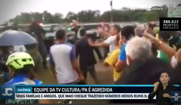 Apoiadores do presidente da República, Jair Bolsonaro (sem partido), foram para cima de uma equipe de reportagem da TV Cultura do Pará. A situação ocorreu em Belém, no último sábado (24).