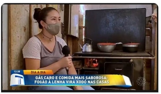 “Gás caro e comida mais saborosa: fogão à lenha vira xodó nas casas”, diz a chamada da reportagem. Ao anunciar a matéria, o âncora chega a dizer que “prefere muito” comida feita em fogão à lenha, mas lamenta não poder usufruir porque mora “em apartamento”.