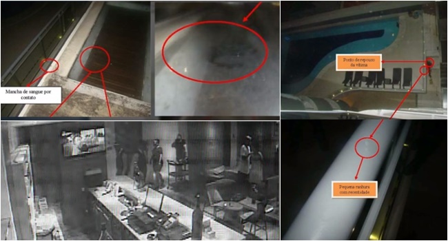 O perito Luiz Alberto Moreira Coelho começa dizendo que o quarto encontrava-se em completo desalinho. As fotos que acompanham o relatório mostram as camas fora de lugar, roupas íntimas espalhadas pelo chão. Nas camas e no banheiro, embalagens de preservativo e uma grande quantidade de toalhas usadas.