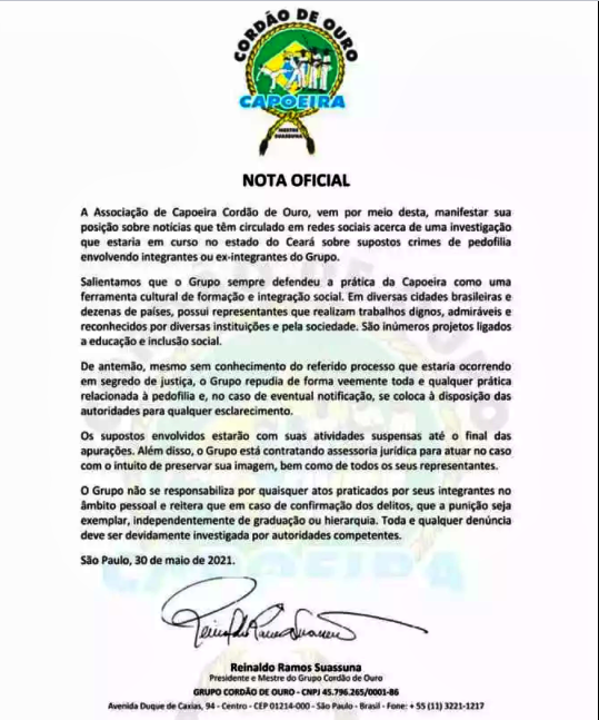 Também foi compartilhado com membros do grupo, no domingo (30/05), uma “nota oficial” da Associação de Capoeira Cordão de Ouro, assinada por Suassuna, sobre as investigações do MPCE.