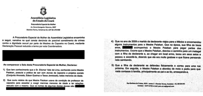O depoimento de Luciana* à Procuradoria Especial da Mulher da Assembleia Legislativa do Ceará, em setembro de 2019, foi um dos relatos que motivaram a abertura de investigação do MPCE. Luciana é casada com um mestre que faz parte do Cordão de Ouro desde a infância e, por isso, recebia em sua casa muitos capoeiristas. Ela denunciou ao órgão dois mestres que teriam assediado suas filhas, ainda crianças, em ocasiões diferentes, sendo um deles do Cordão de Ouro.